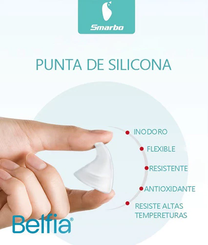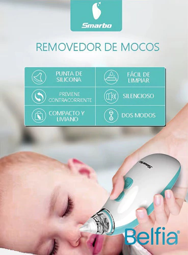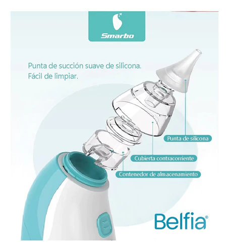 Incluye dos boquillas de silicona, que son suaves y seguras para la delicada mucosa nasal de los bebés. Además, su diseño lavable permite una higiene óptima, garantizando que cada uso sea seguro y limpio. Este aspirador nasal es libre de BPA, lo que lo convierte en una opción segura para el cuidado de la salud de los más pequeños. Con una alimentación a pilas, el Belfia P12 es práctico y portátil, ideal para llevar en el bolso del bebé o en viajes. Su diseño ergonómico facilita su manejo, permitiendo que los padres lo utilicen con una sola mano. Mantener la salud respiratoria de tu hijo nunca ha sido tan sencillo y efectivo.