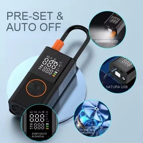 Diseño multifuncional: este producto viene con una variedad de características, que incluyen parada automática, iluminación LED, luz de emergencia, indicador de energía y monitor de presión de neumáticos, lo que lo convierte en una herramienta versátil para los usuarios que valoran la comodidad y la seguridad, particularmente para los usuarios que viajan con frecuencia de noche o en condiciones de poca luz.