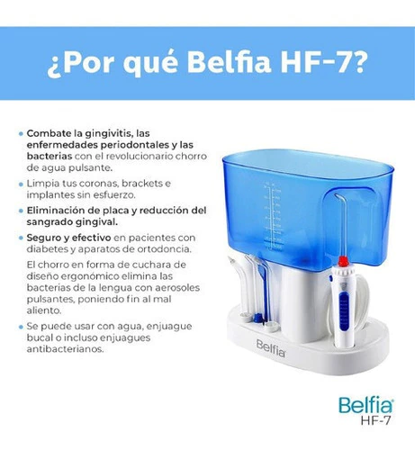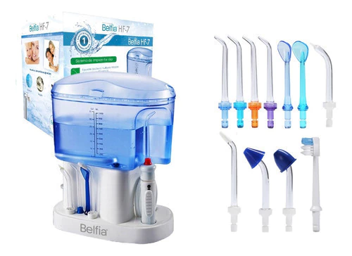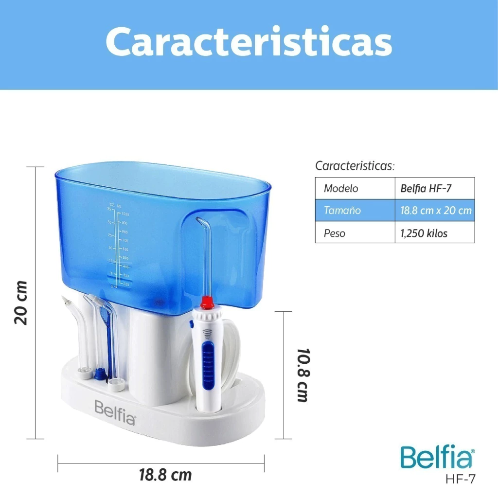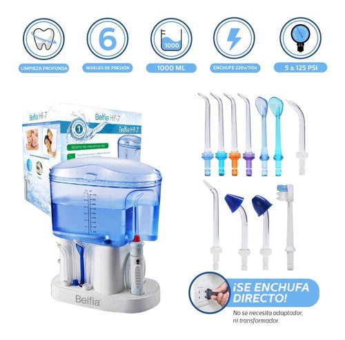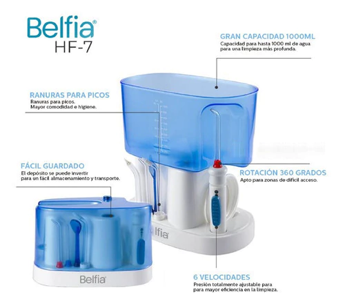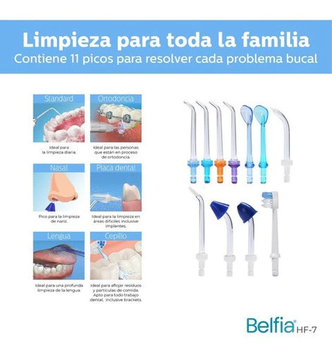 BELFIA HF7, IRRIGADOR BUCAL ORAL FAMILIAR IDEAL PARA UNA LIMPIEZA EXHAUSTIVA, 11 PICOS, 6 NIVELES DE PRESIÓN, CUENTA 125 PSI, 220V, CAPACIDAD MAXIMA DEL MERCADO DE 1000 ML. INCLUYE 2 PICOS PARA LIMPIEZA LAVADOS NASALES.