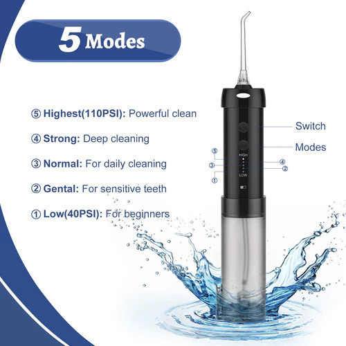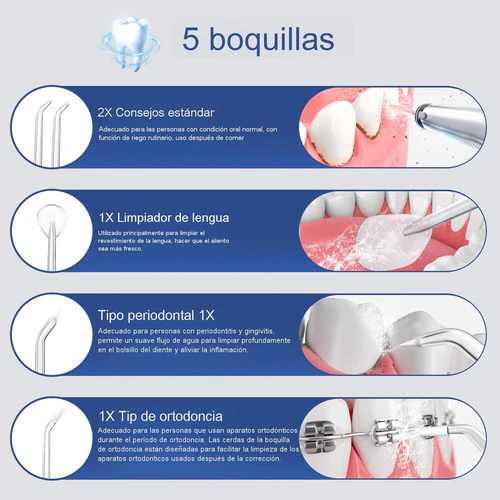 Con 5 niveles de presión bien diferenciados y una presión máxima de 110 psi, podrás ajustar la intensidad según tus necesidades y preferencias. Sus 5 boquillas incluidas te permitirán realizar una limpieza completa, llegando a todos los rincones de tu boca. Desde la limpieza de lengua hasta la eliminación de sarro, este irrigador bucal tiene funciones específicas para cada necesidad.