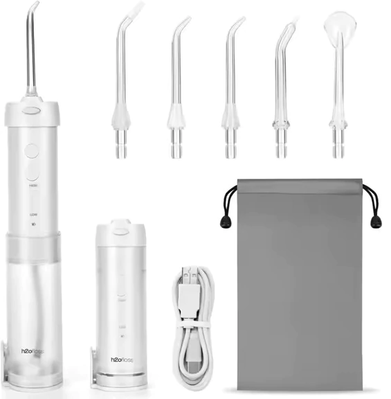 El paquete incluye una variedad de accesorios para satisfacer sus necesidades de cuidado bucal, que incluye dosboquilla estándar para limpieza general, una boquilla para limpieza de lengua, una boquilla para bolsillos periodontales y una boquilla para ortodoncia. Además, se proporciona un cable de carga para garantizar que su irrigador esté listo para su uso en todo momento.