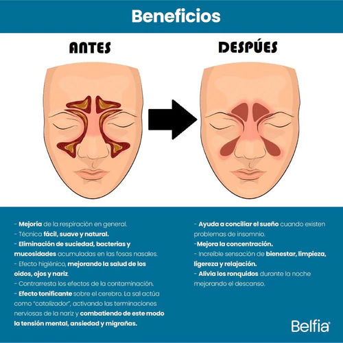 - Eliminación de suciedad, bacterias y mucosidades acumuladas en las fosas nasales.